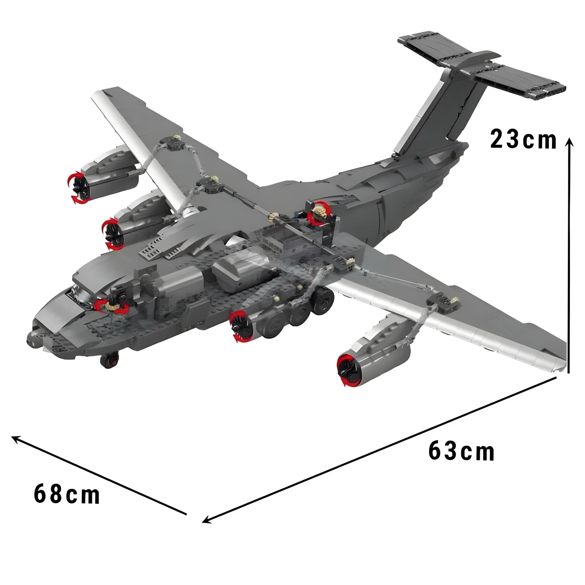 Embark on a thrilling building adventure with the Y-20 Large Military Aircraft, a detailed model that boasts an impressive wingspan of 68 cm and stretches over half a meter in length.