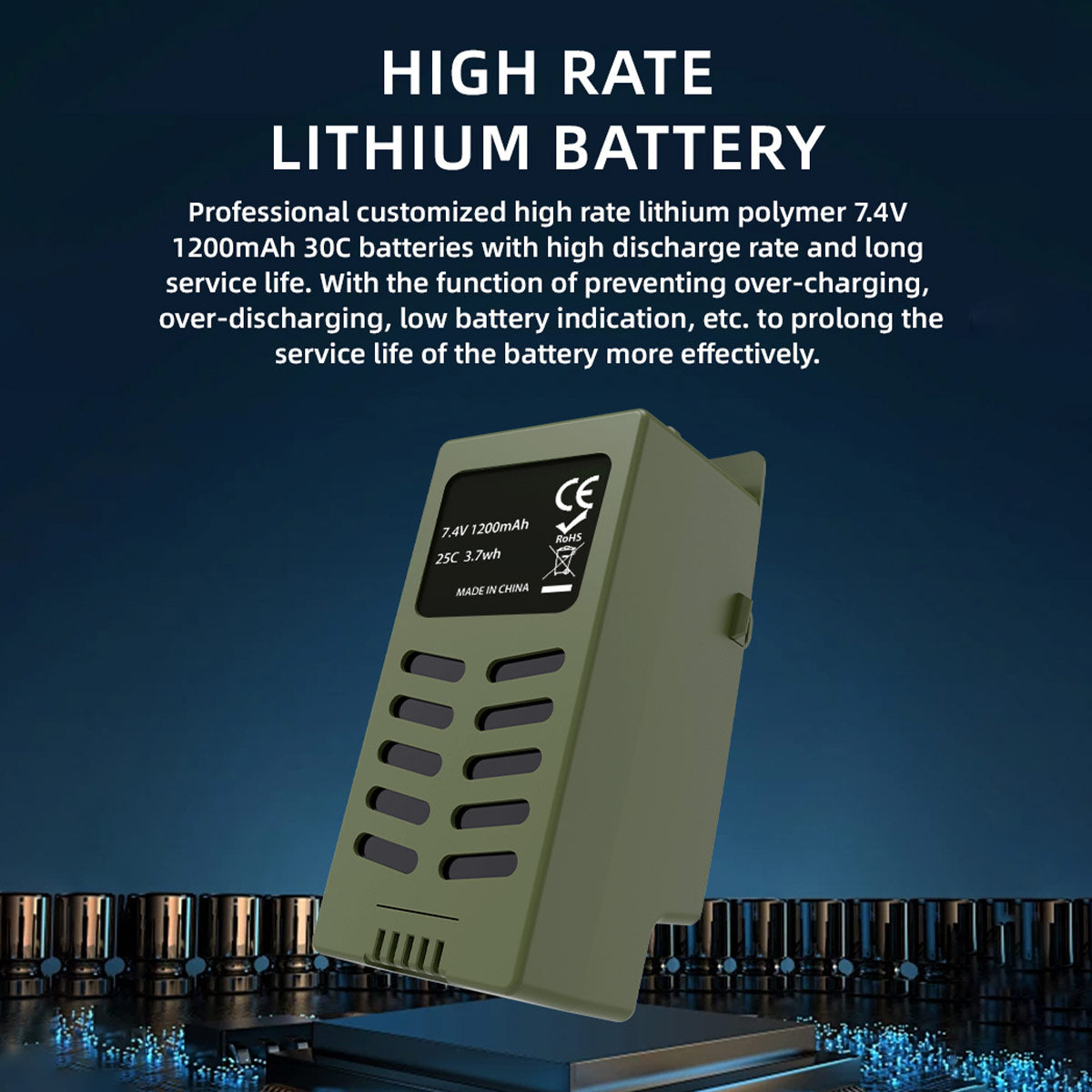 14. Professionally customized high-rate lithium polymer 7.4V 1200mah 25C battery, high discharge rate and long service life. The flight time is about 9-12 minutes, and it can be used for 500+ cycles under normal use. It has functions such as preventing overcharge, over-discharge, and low-power indication, which can more effectively extend the battery life.