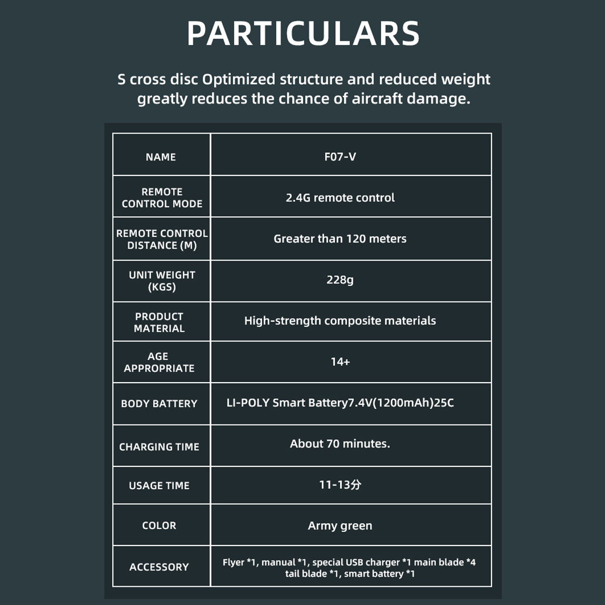 The YU XIANG F07/F07-V is a 1/34 scale RC helicopter modeled after the iconic Bell UH-1 Huey. This model offers a blend of realistic design and advanced flight features, making it suitable for both beginners and experienced pilots.