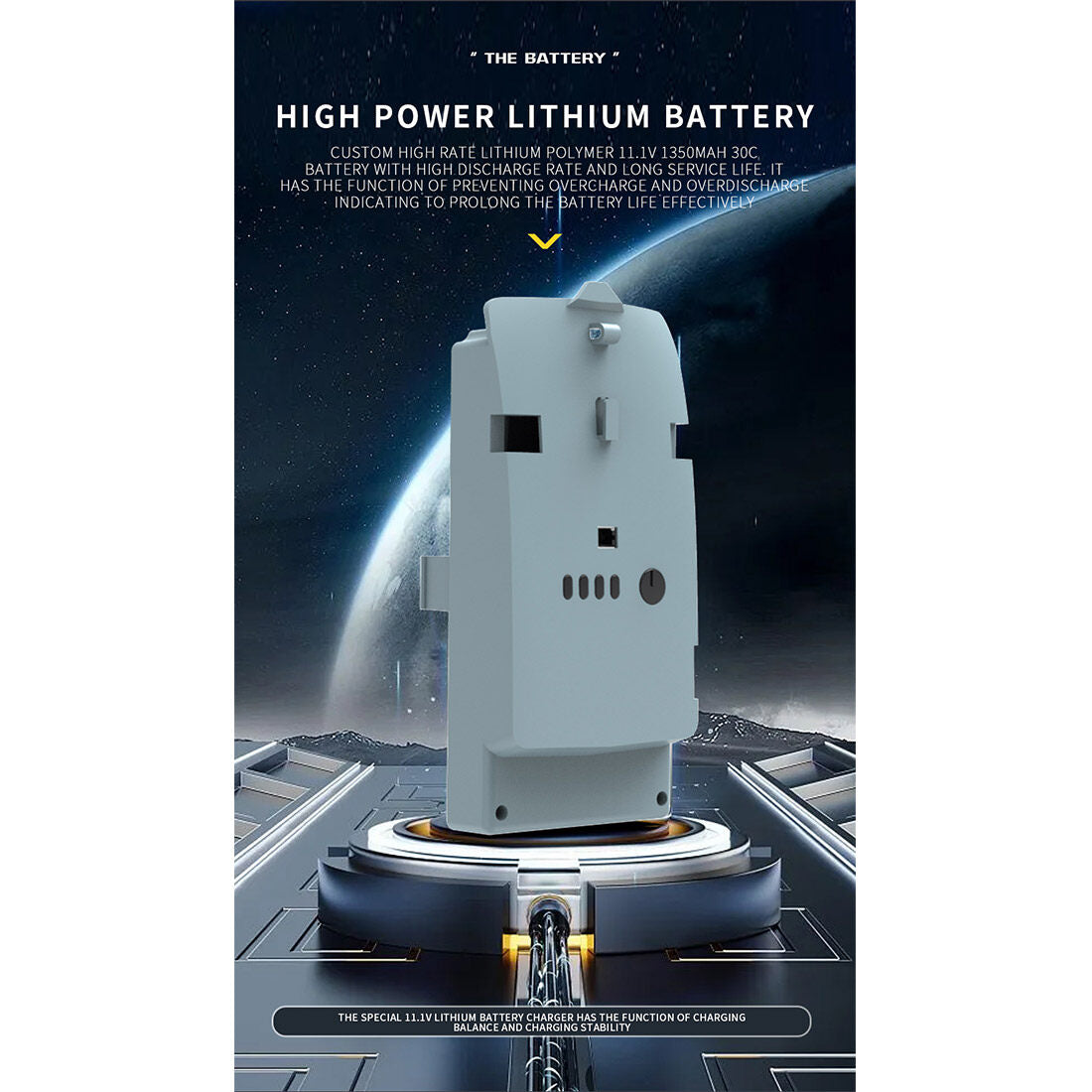 11.Customized high-rate lithium-polymer 11.1V 1350mAh 30C battery with high discharge rate for long lifespan and flight time of approximately 9-12 minutes, with over 500 cycles under normal use. Equipped with functions to prevent overcharging, overdischarging, and low battery indication, effectively extending battery lifespan.