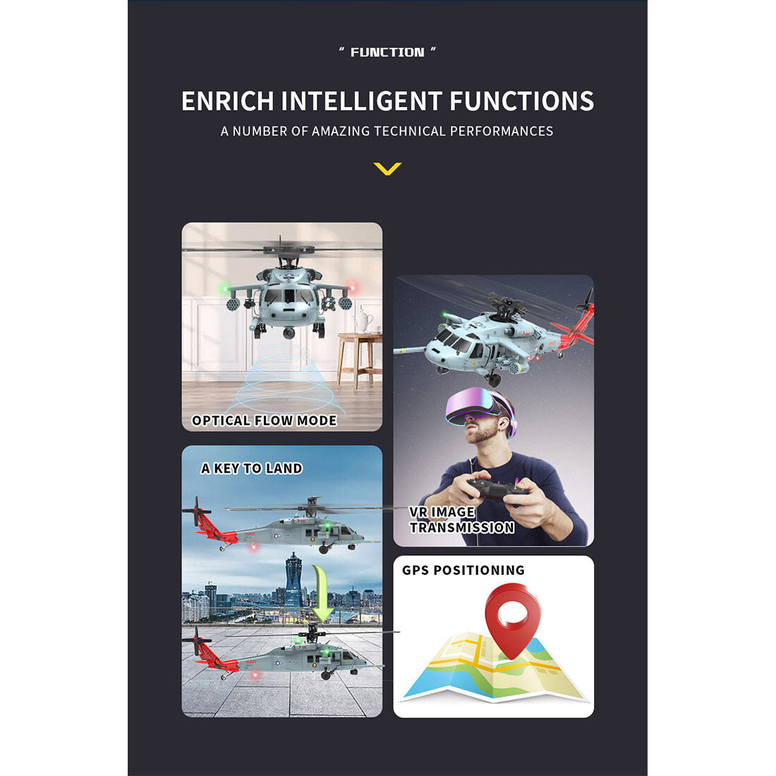 1. Scaled down in a 1:47 ratio based on the U.S. SH60-Black Hawk helicopter, featuring highly realistic exterior details, cool lighting, movable left and right side doors, and shock-absorbing landing gear.