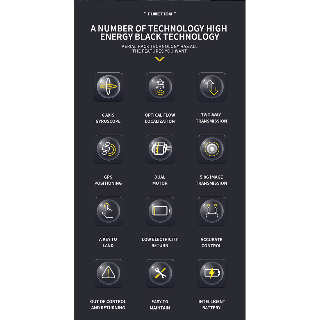 8.Intelligent flight control with GPS module, compass module, downward vision module, and barometric altitude hold module. Offers GPS stabilization, downward vision flight, manual stability mode, and multi-functional flight modes including one-key return, low battery intelligent return, loss of control return, one-key landing, electronic fence, one-key figure-eight flight, and one-key circular flight for safe flying.
